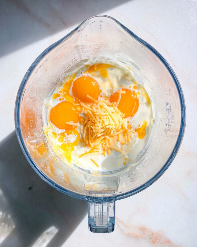 - Blend the base: While the vegetables cool, combine the eggs, cottage cheese, 1% milk, ½ cup of the Colby-Jack cheese, and the remaining ⅛ teaspoon salt in a blender. Process on low speed for 20 seconds until the mixture is completely smooth and creamy.