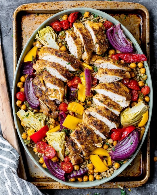 - Rest and Serve: Remove the sheet pans from the oven. Let the chicken rest on the pan for 5 minutes before slicing. Garnish everything generously with fresh parsley. Serve immediately with farro or quinoa and a fresh lemon wedge on the side.