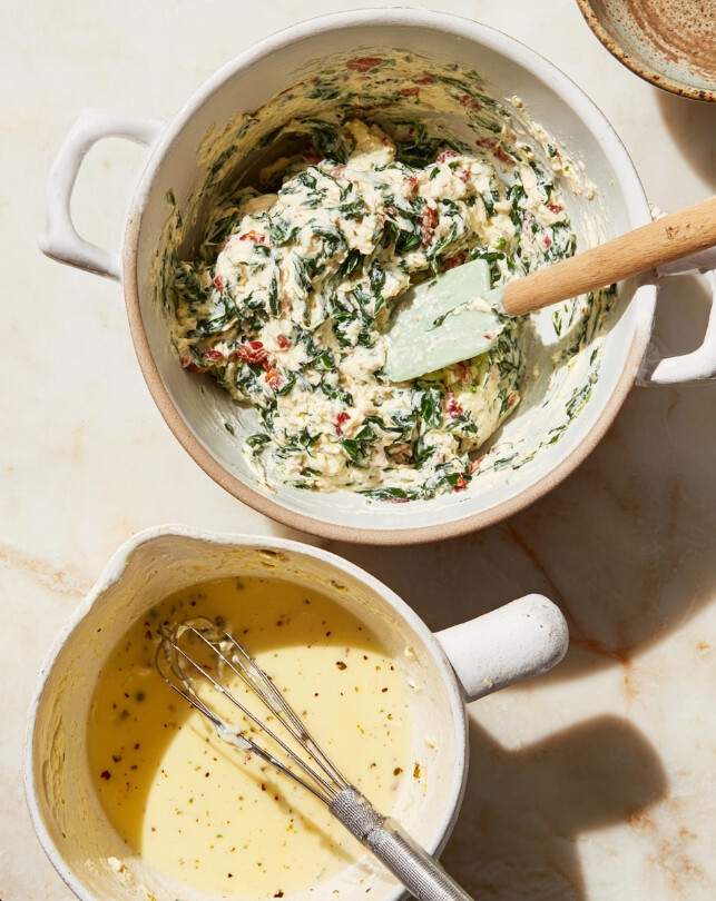 • Mix the spread: Transfer roughly ½ cup of the hot spinach mixture into a medium mixing bowl. Add the softened cream cheese, ¾ cup of the crumbled feta, and ¼ teaspoon of black pepper. Stir vigorously with a spatula until the heat from the veggies helps blend everything into a smooth, savory paste.