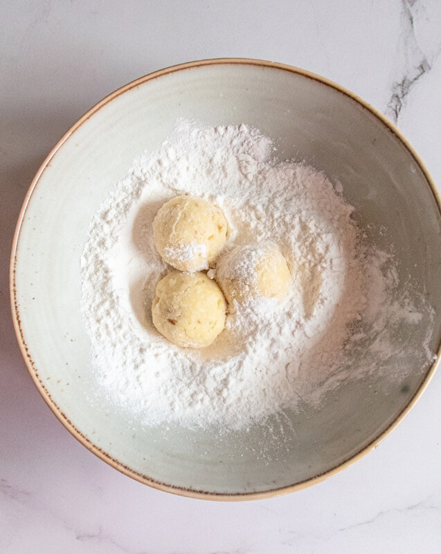 The final step is the “snow” coating. Rolling them in powdered sweetener gives them that festive look. Just make sure the cookies are cool; otherwise, the sweetener will melt and get sticky.