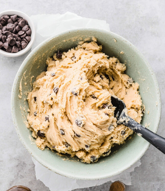 Once you add the melted butter and vanilla, the mixture might look crumbly at first. This is normal! As you stir, and add the almond milk teaspoon by teaspoon, it transforms into a cohesive, soft dough. Folding in the sugar-free chocolate chips is the final step before shaping.