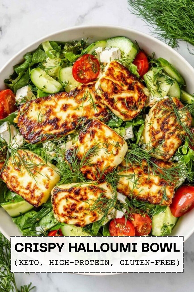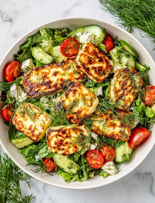 Enjoy crisp, pan-seared halloumi over a vibrant medley of fresh cucumbers and juicy tomatoes. A simple, savory dressing brings this refreshing Mediterranean-style salad together in minutes.
