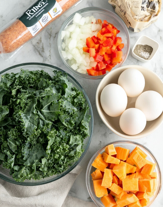 - Assemble the bake: Spread the cooked sweet potato mixture evenly across the bottom of the prepared baking dish. Layer the sausage and kale mixture over the top. Pour the beaten eggs slowly over the entire dish. Gently shimmy the pan back and forth to settle the mixture and ensure the eggs fill all the gaps.