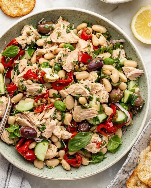 - Combine the Salad : Add the chopped roasted red peppers to the salad base. Flake the drained tuna into large chunks and gently add it to the bowl, being careful not to break it up too much.