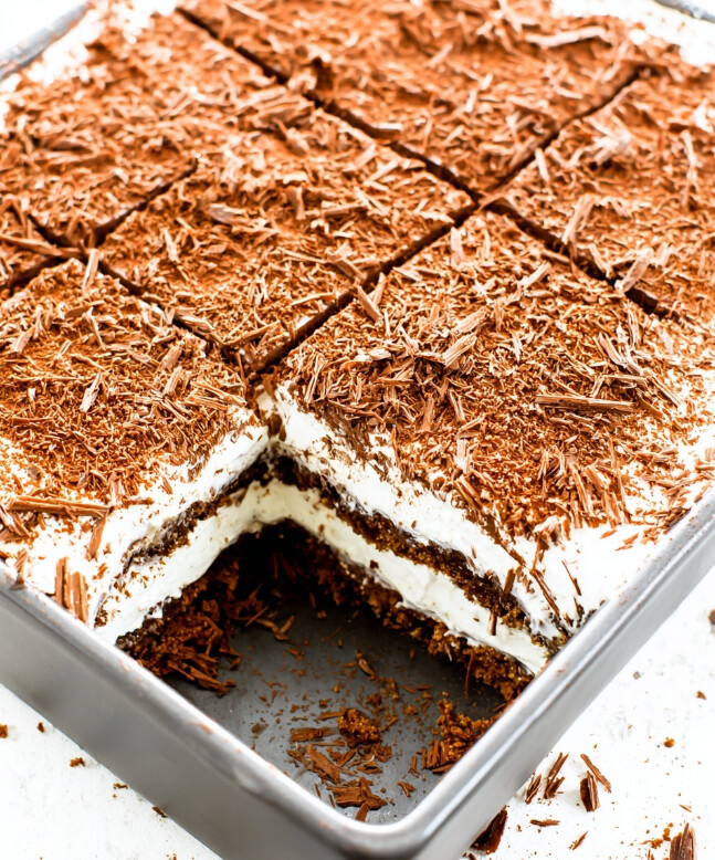 Finally, I top everything with freshly whipped cream and shaved sugar-free dark chocolate. It needs a good chill in the fridge—at least 4 hours—to set properly so you can slice clean squares.