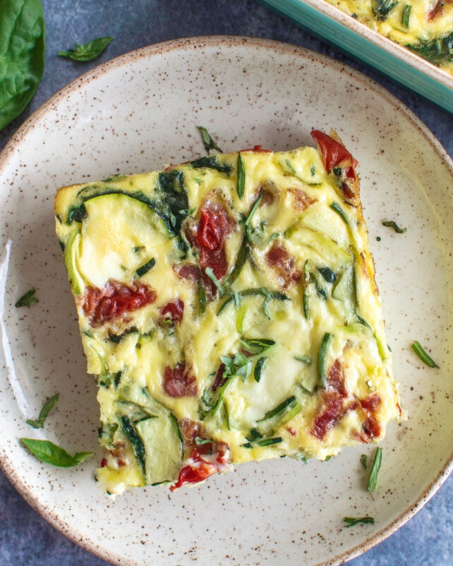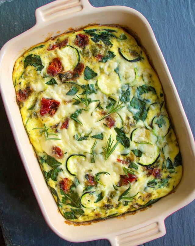 • Bake: Pour the egg and vegetable mixture evenly into the prepared casserole dish. Bake for 40–45 minutes, or until the center is firm and the edges are lightly golden.