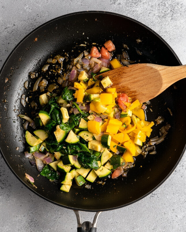 • Soften the vegetables: Add the thinly sliced zucchini to the pan and sauté for 2 minutes. Stir in the chopped tomatoes and spinach. Cook for another 2–3 minutes until the spinach wilts and much of the liquid from the tomatoes has evaporated.