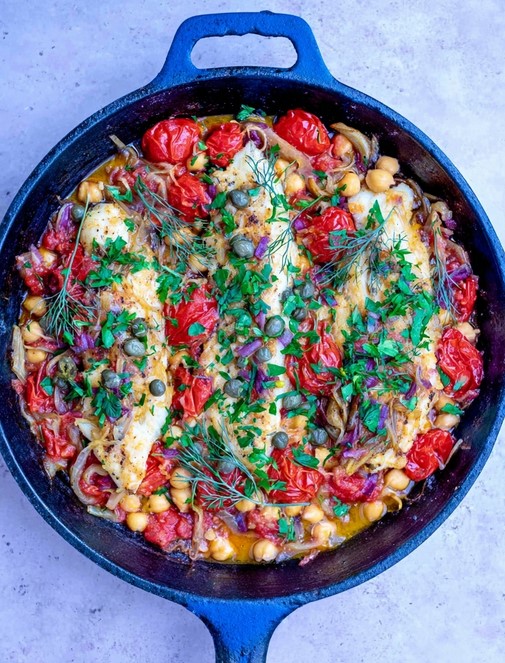 - Meal Prep It. You can make the entire vegetable and chickpea base ahead of time and store it in the fridge. When you’re ready for dinner, just place the fish on top, add the topping, and bake!