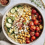 Assemble the Salad: Pour the vinaigrette over the slightly warm couscous and toss to coat. Slice the remaining 2.5 cups of raw cherry tomatoes in half. Add the raw tomatoes, the reserved roasted tomatoes, the roasted chickpeas, sliced cucumbers, torn basil, and chopped fresh oregano to the bowl. Toss gently to combine. Top with the crumbled feta cheese and garnish with oregano sprigs.